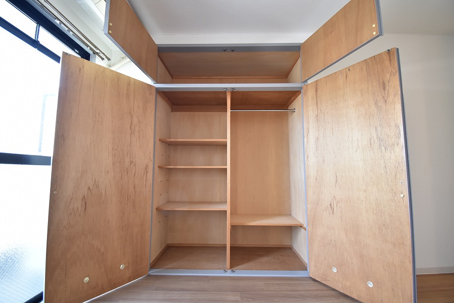 大容量の収納です。ハンガーが掛けられるようにバーがございます。
